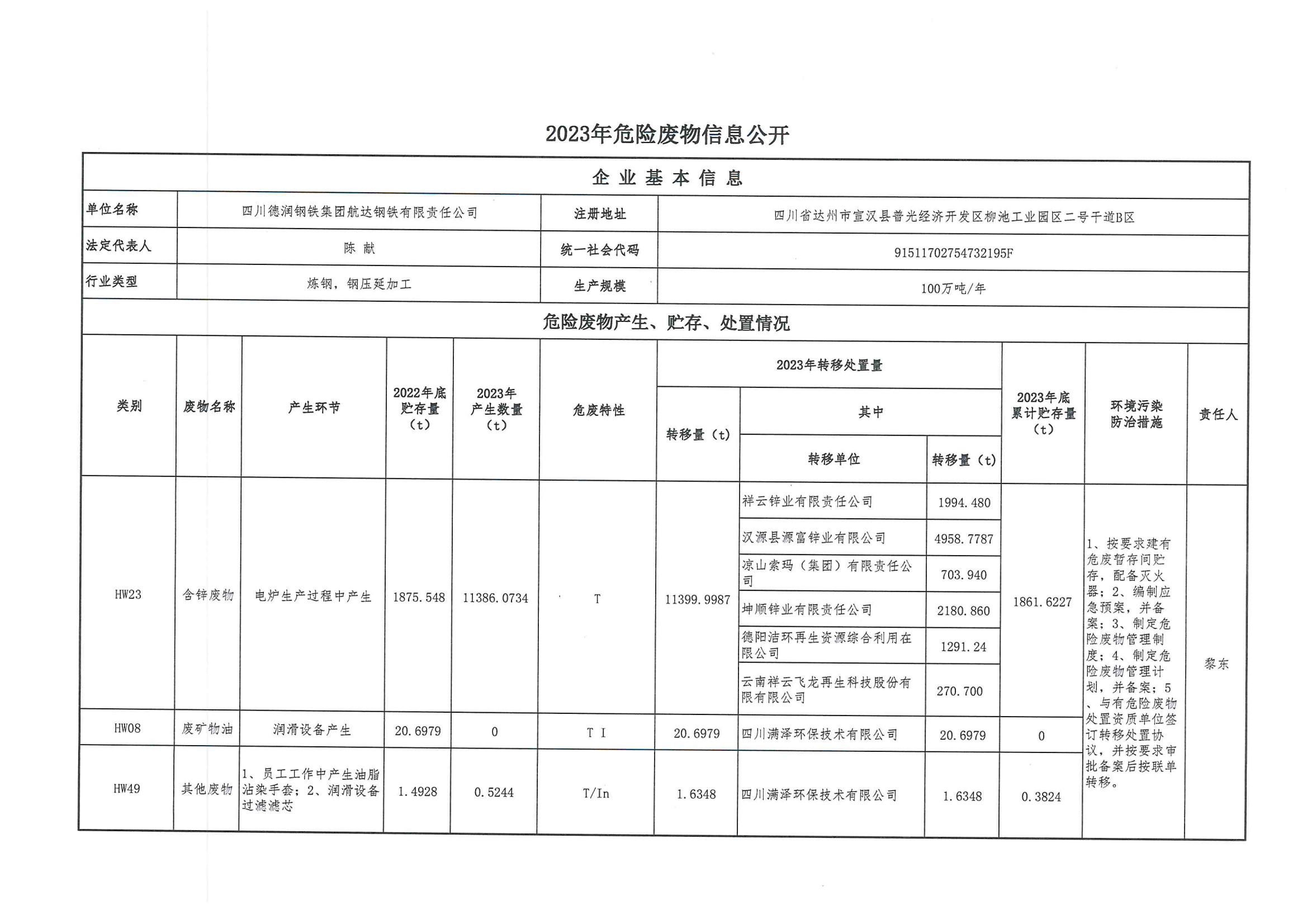 航達鋼鐵2023年危險廢物信息公開